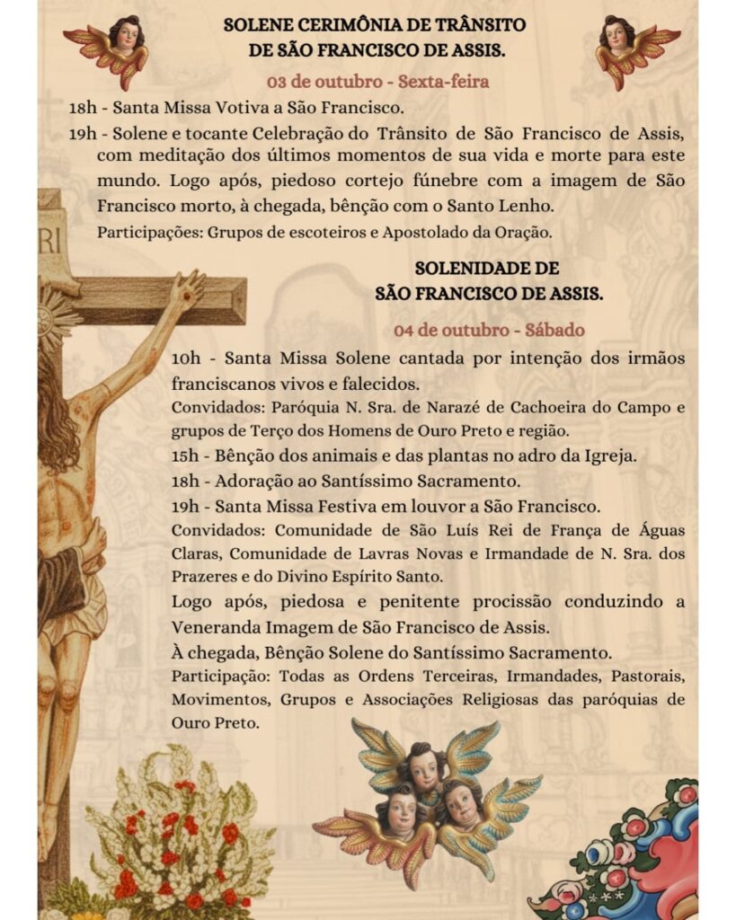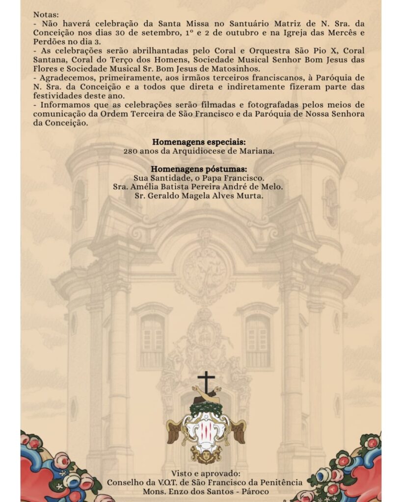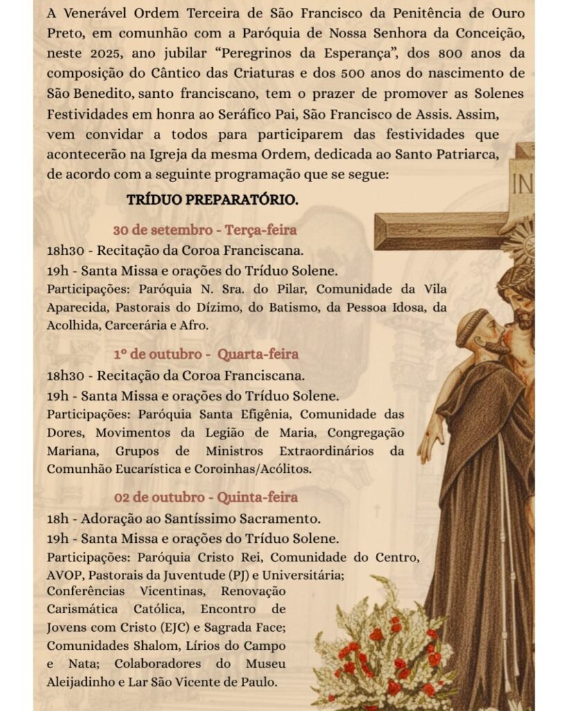 03/10/2025A Venerável Ordem Terceira de São Francisco de Assis, em comunhão com a Paróquia de Nossa Senhora da Conceição, tem a imensa alegria de convidá-los para as Festividades em honra a São Francisco de Assis, que acontecerão entre os dias 30/09 a 04/10, na Igreja de São Francisco de Assis.